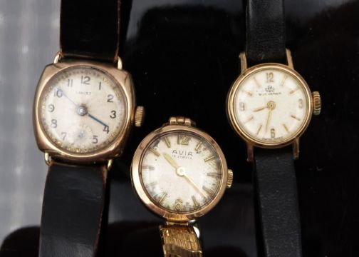 Two 9ct gold ladies wristwatches Avia and Lancet cushion cased together with a gold plated Bucherer, largest case diameter 22mm