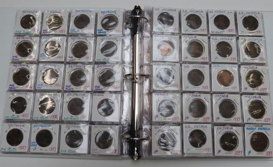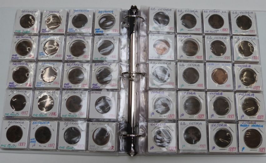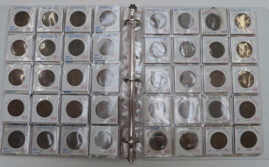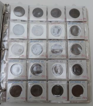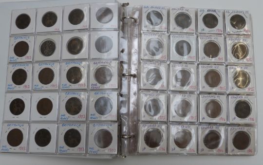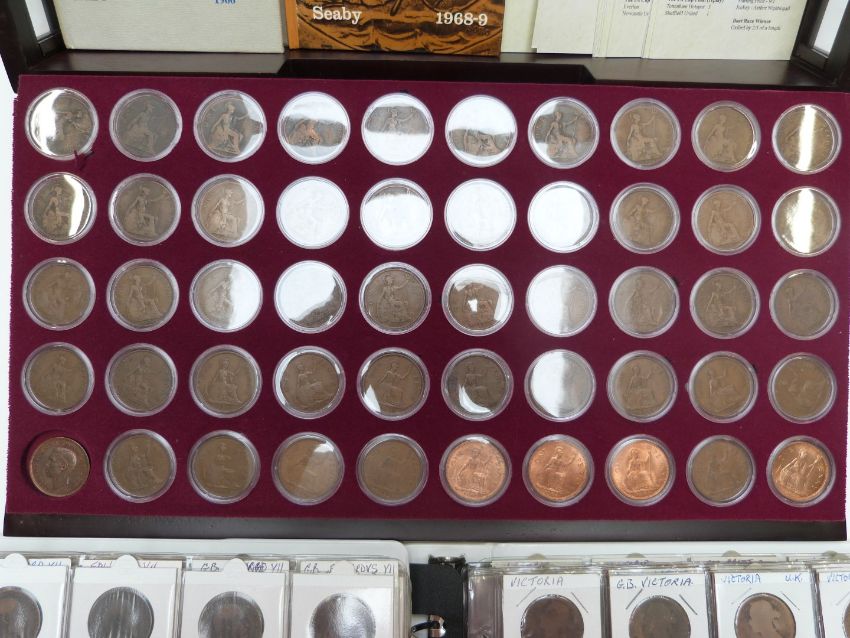 Danbury Mint glass-topped coin cabinet containing a Study of Pennies 1901-1967 with key event cards for each year, together with two further albums of 1880-1910, approximately 20 coins for each year