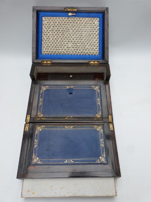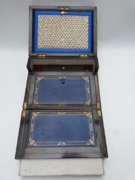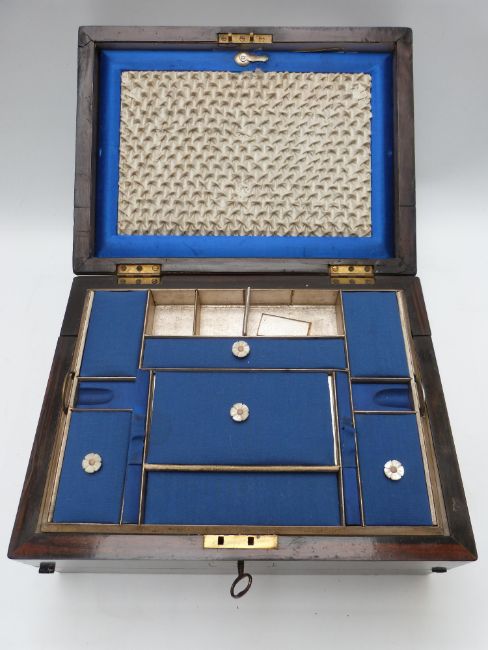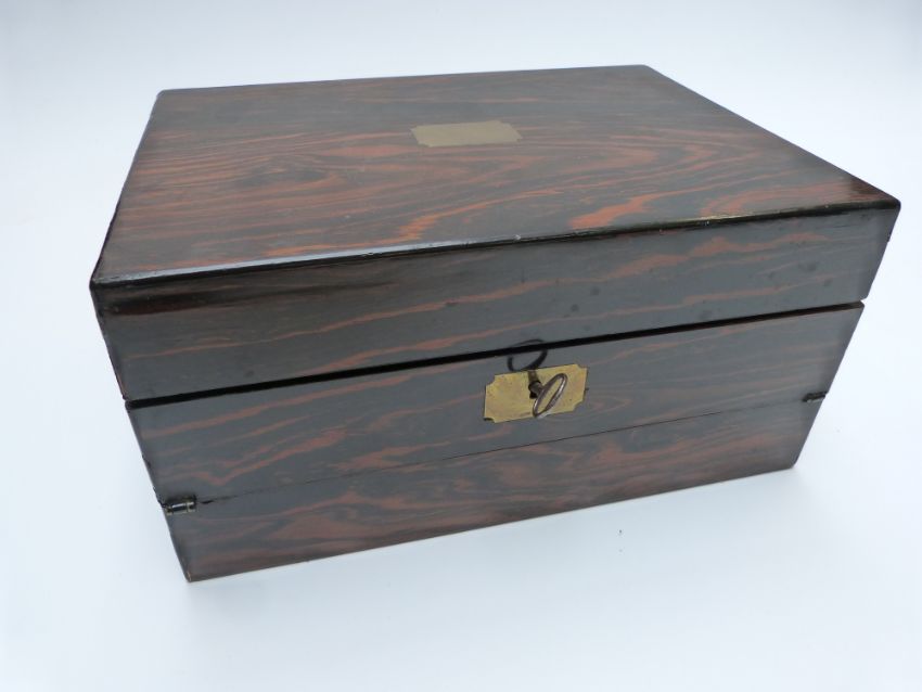 Coramandel work box / writing slope, with lift out tray of lidded compartments and fold out writing slope below