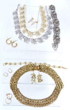 A silver and mother of pearl rattle, pearl necklaces, Butler & Wilson necklace, D'Orlan, a 9ct gold earring (2.4g) etc