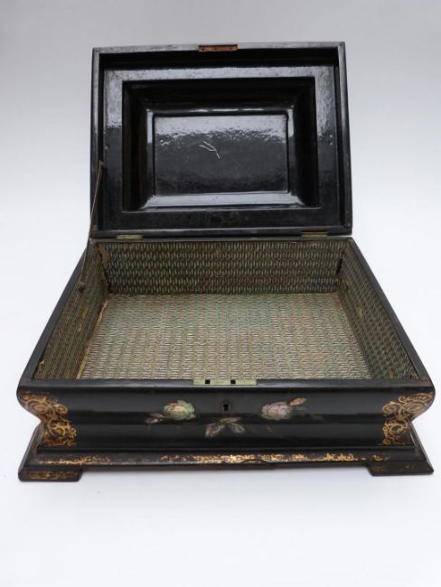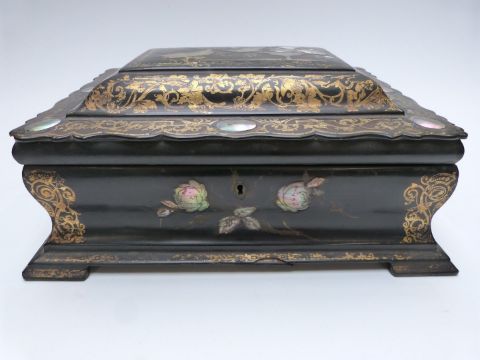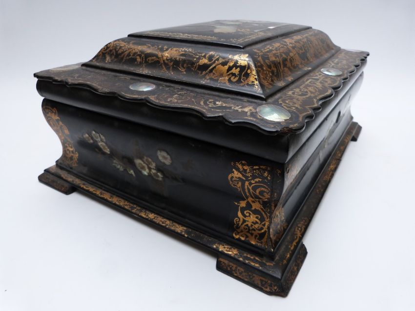 Jenners and Bettridge or similar mother of pearl inlaid workbox raised on four stepped feet, W37 x D29 x H16cm
