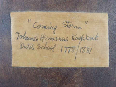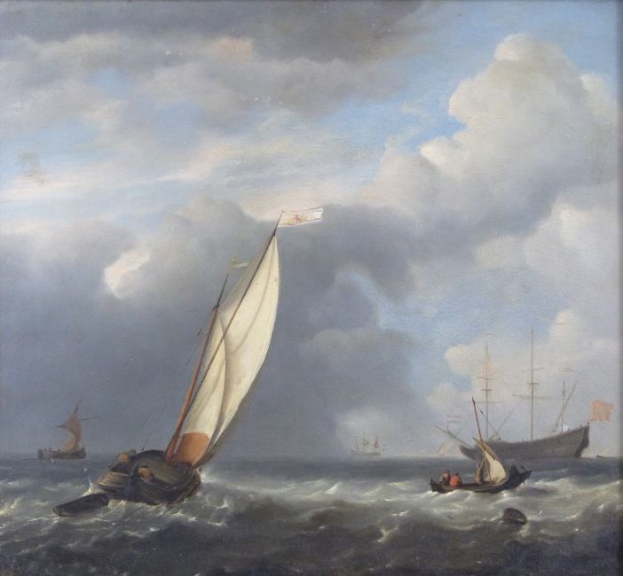 Attributed to Johannes Hermanus Koekkoek (Dutch 1778-1851) oil on board, sailing ships on a choppy sea, indistinctly signed lower left, label verso, 38 x 42cm