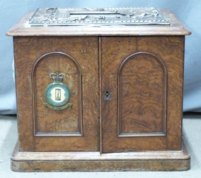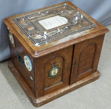 Victorian burr walnut collector's cabinet, the twin arched panelled doors opening to reveal five graduated drawers with campaign handles and similar handles to the exterior, W54 x D44 x H44cm
