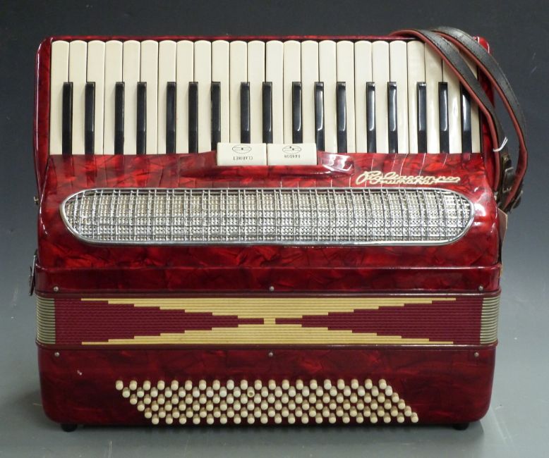 Pigliacampo Numano 120 bass piano accordion, in red pearloid finish with two treble couplers, numbered 309/4/120/2/4/1, in original carry case