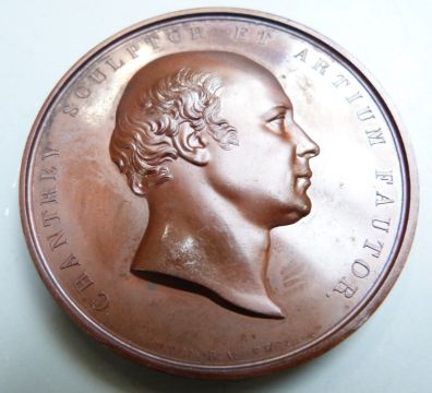 Victorian bronze laudatory / commemorative medal for Francis Chantrey, sculptor (1781-1841), depicting his statue of James Watt and bust of Chantrey, designed by William Wyon, RA, D54.8mm