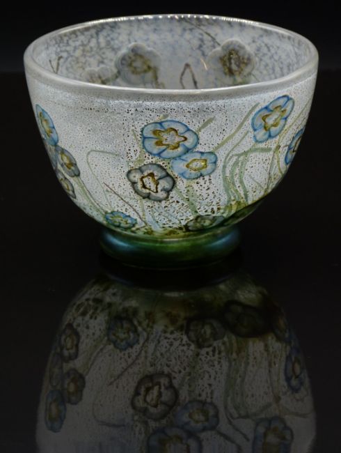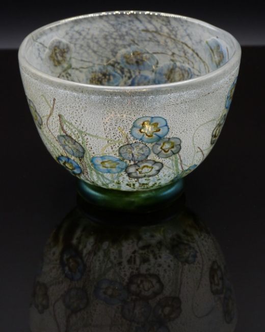 Isle of Wight footed glass bowl with iridescent flower decoration over a pearl ground, 9.5cm in diameter.