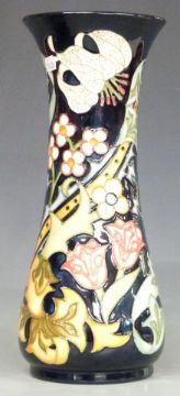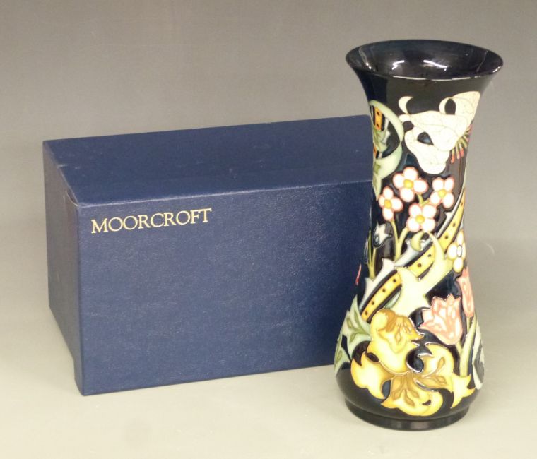 Moorcroft William Morris design pedestal vase decorated in the Golden Lily pattern on unusual black ground by Rachel Bishop and dated 1993, boxed, H 31cm