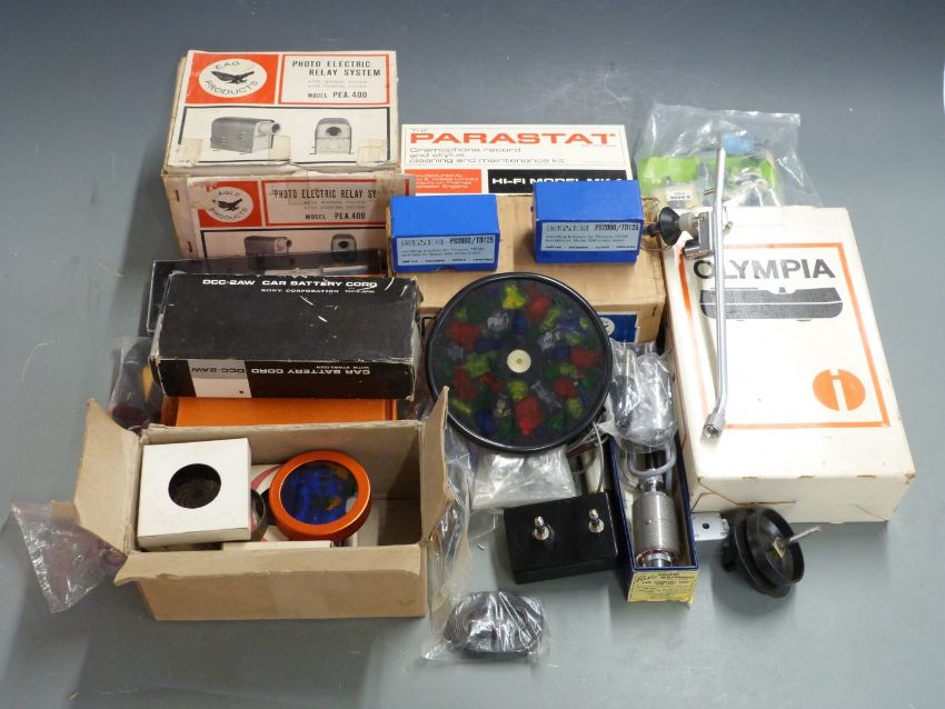 Parasat, Panda and Bib Groove Kleen gramophone record and stylus cleaning kits, used pick up arm, SME/Thorens spare parts etc
