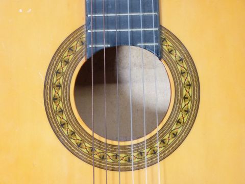 Two acoustic guitars fitted with nylon strings, one unlabelled in high gloss lacquered finish, the other a Spanish Admira Malaga model