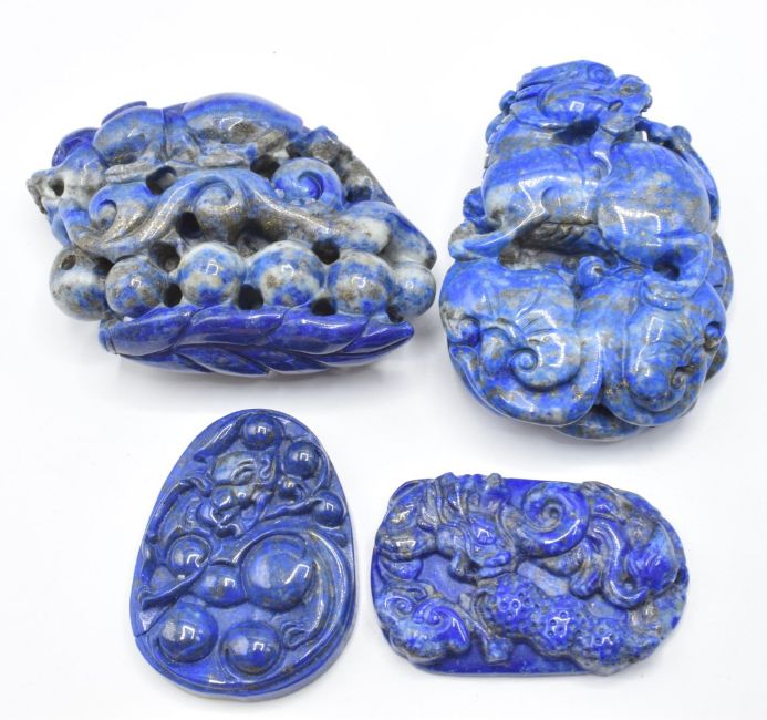 Two Chinese lapis lazuli carvings depicting Foo Dogs and two Chinese lapis lazuli pendants depicting dragons, largest 7.5 x 4.8cm