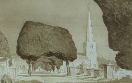 Oliver Heywood (1920-1992) watercolour Painswick churchyard with yew trees, 22.5 x 37cm