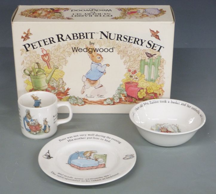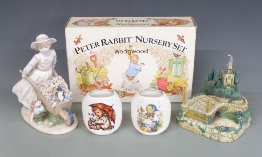 Wedgwood Beatrix Potter Peter Rabbit nursery set, Goebel Hummelscapes 'Going to Church', Hummel vases and a Nadal limited edition figurine, tallest 23cm