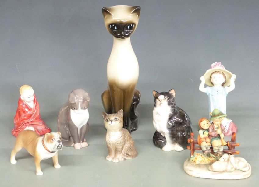 Royal Doulton figures Make Believe and This Little Pig, Goebel Hummel, Bing & Grondahl cat, Beswick and Royal Doulton cats, Branksome bulldog etc, tallest 29cm