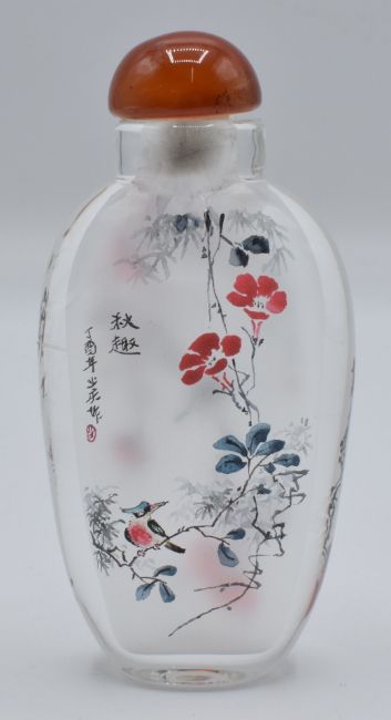 Chinese reverse painted glass scent bottle decorated with birds and foliage, H7.5cm