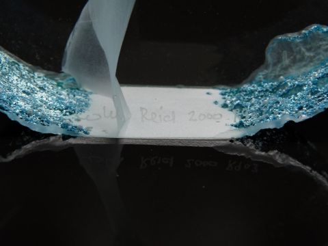 Colin Reid (b.1953) Flacon series kiln cast and polished crystal glass scent bottle sculpture with textured blue metal oxide finish, signed 'Colin Reid 2000 R903', 16.5cm in diameter.