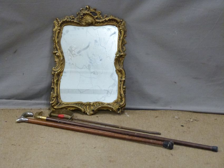 Shaped decorative mirror, 37 x 57cm, walking sticks etc