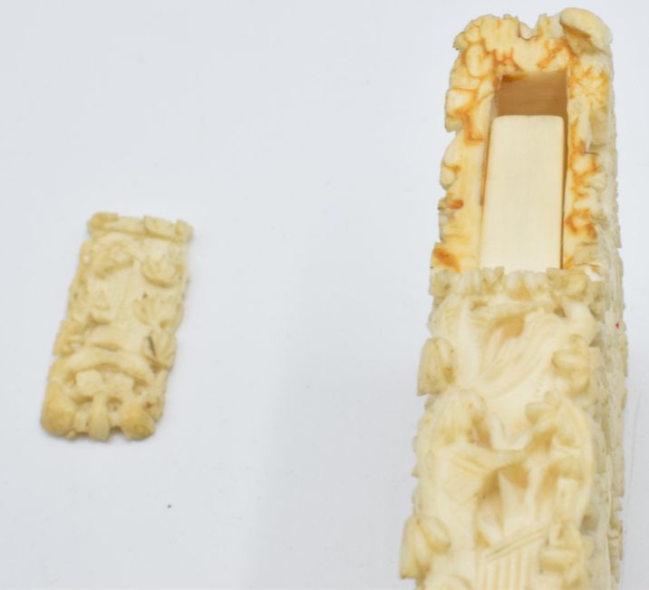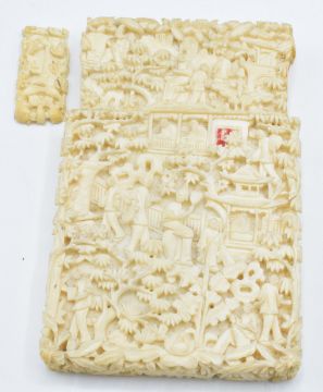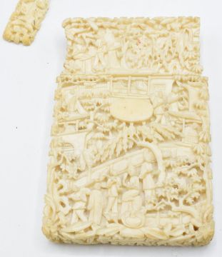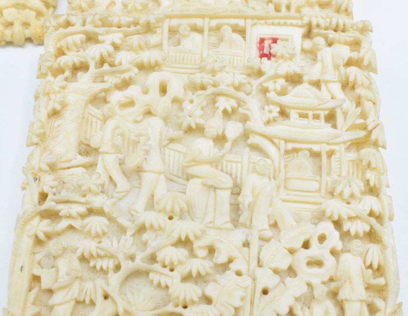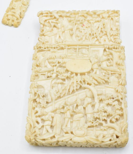 A 19thC Chinese carved ivory card case depicting figures and a village scene, 10 x 6.8cm