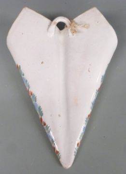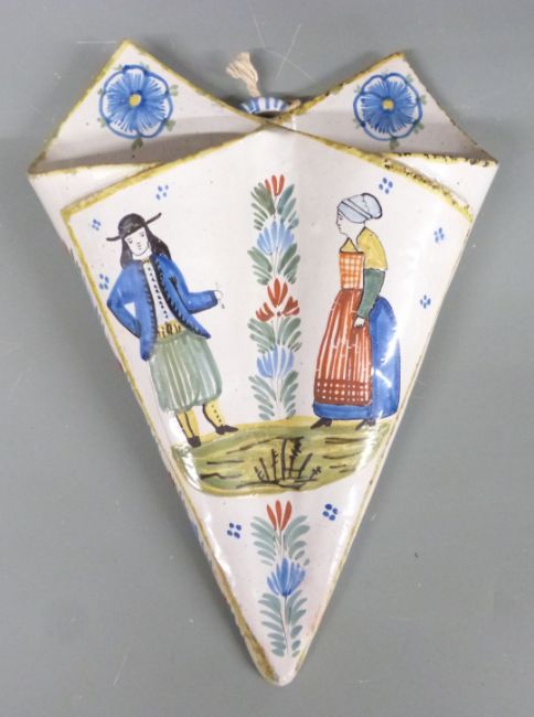 French Quimper style wall pocket and a pair of moon flasks, H29cm