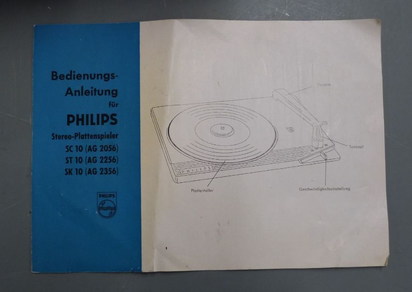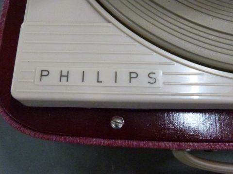 Phillips record player model type AG 2355/22, c1950s, in burgundy and grey Rexine finish, in original box with some paperwork