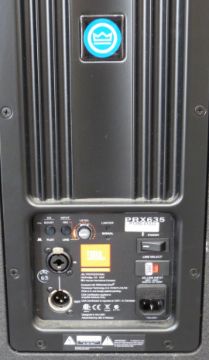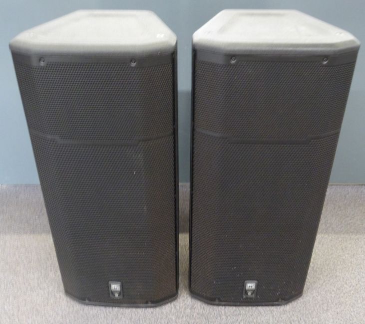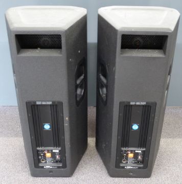 A pair of JBL professional large stereo speakers, 'powered by Crown' to base, with recessed handles, maximum width 44 x H93cm