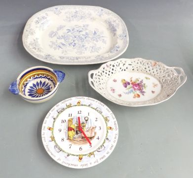 A collection of ceramics including Dresden style pierced basket, Quimper, Victorian jugs, George Jones Abbey pattern large dish, Royal Doulton Winnie the Pooh clock etc