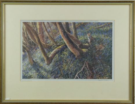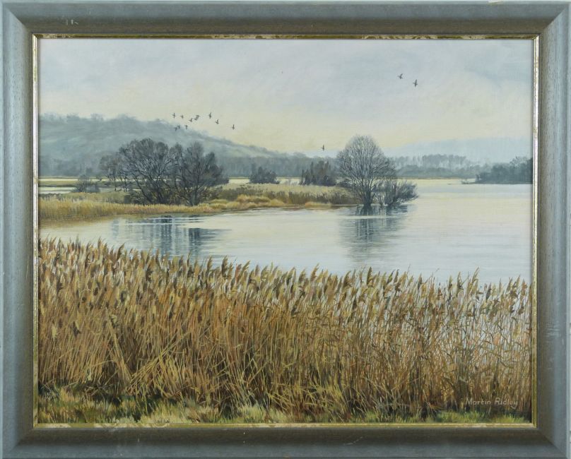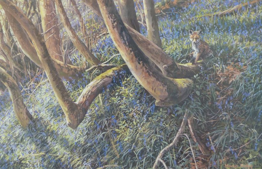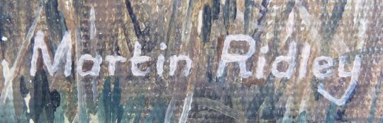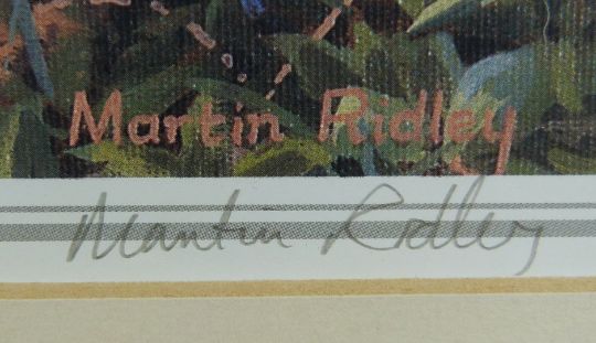 Martin Ridley acrylic on board river scene signed lower right, 34 x 44cm and a Martin Ridley print of foxes in woodland