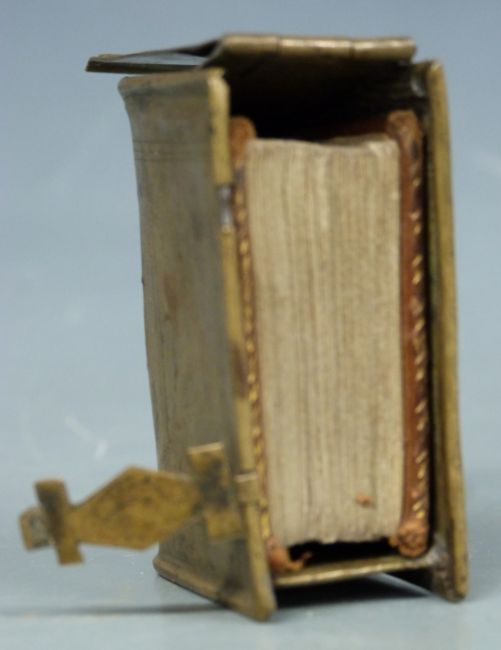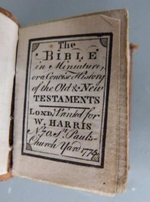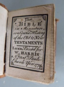 [Thumb Bible] 18thC miniature bible printed for W. Harris of St Pauls Church Yard 1775 with several engravings bound in full calf with gilt ruled spine in brass book shaped container with clasp, the book 4.5 x 3.5cm, the container 5.5 x 4cm