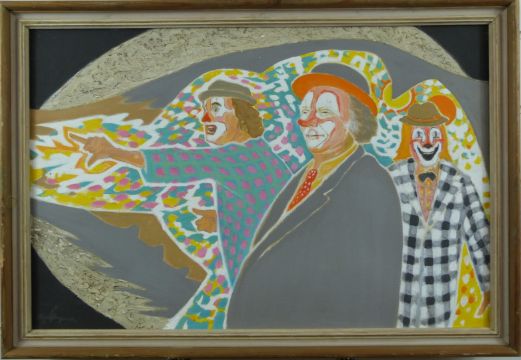 Oliver Heywood (1920-1992) oil on canvas Three Clowns, Robert's Brother's Circus 1975, 40 x 59cm. The artist and his wife travelled with the circus for several months, see his other circus paintings at www.oliverheywood.com