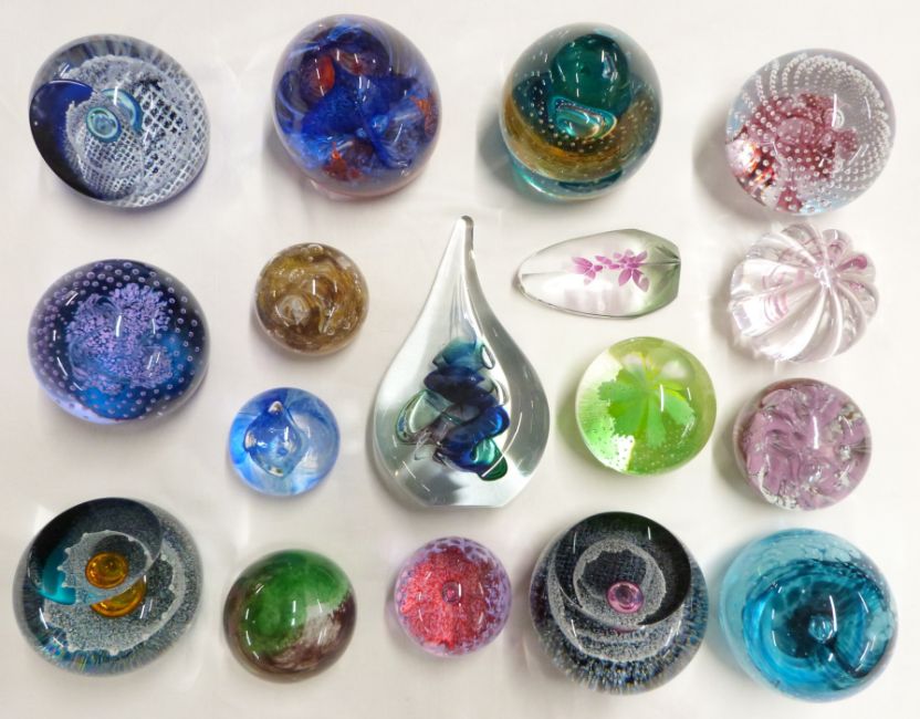 Eighteen Caithness, Mdina and similar glass paperweights including We Three Kings Gold, Frankincense and Myrrh limited edition set.