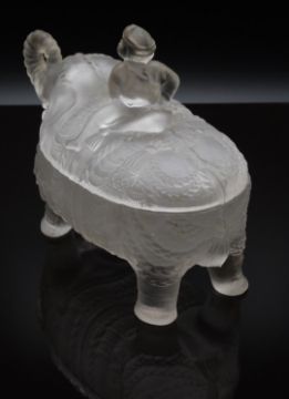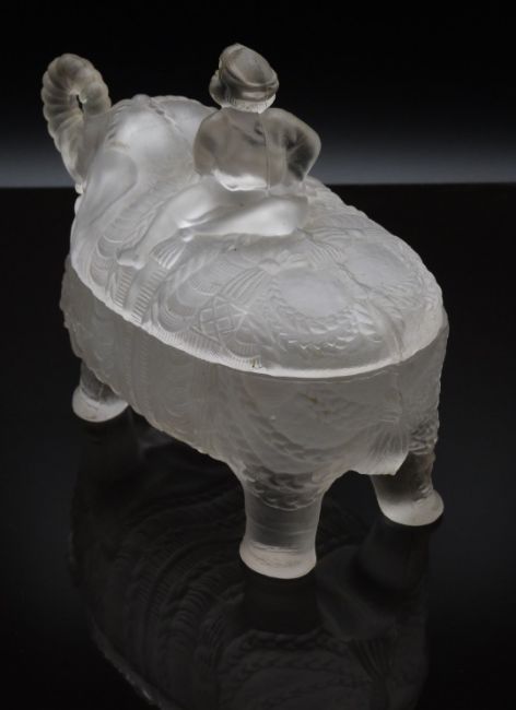 Portieux France frosted glass covered casket in the form of an Indian boy riding an elephant elephant, 18cm long, 15cm tall.