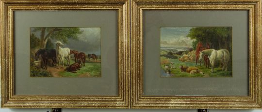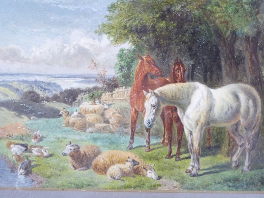 A pair of oils on board of horses, sheep and ducks, probably 19thC, in modern frames, unsigned, 13.5 x 19.5cm