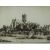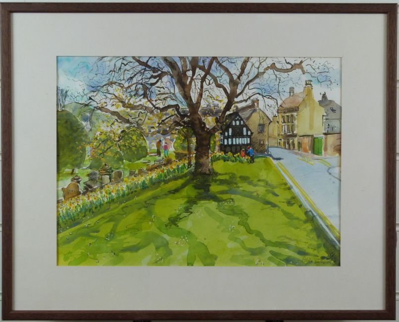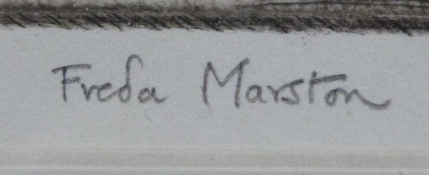 Freda Marston black and white engraving of a riverside cathedral, pencil drawing of a village signed Montbrien 188? and a watercolour Painswick churchyard, Gloucestershire, largest 28 x 38cm