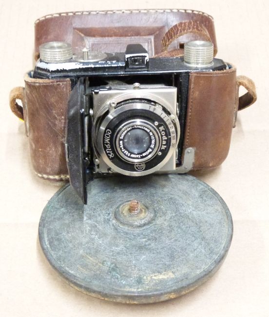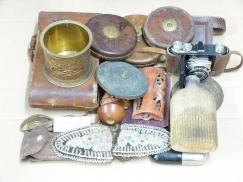 Collection of cameras, spirit flasks, leather tape measures, Jolly Tumbler game, Georgian brass, chin strap, brass coronet