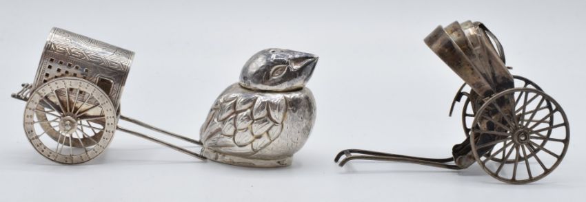 Chinese silver pepper in the form of a chick with character marks to base, L5cm, and two silver rickshaws with marks to base, one maker GW, weight 55g