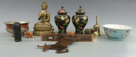 A pair of Chinese cloisonné covered vases, Indian brass deity etc, tallest 16cm