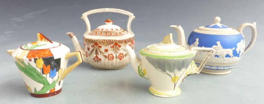 Russian enamelled porcelain dish with metal surround, four teapots including Copeland and Art Deco examples and a 19thC Chinese export tureen