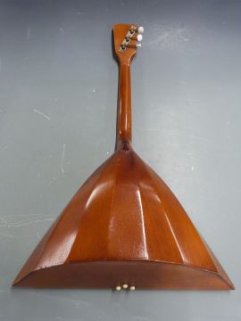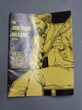 Russian made mid-century balalaika with parquetry decoration to table, label inside with number 19110 n. 1968, with John Peasse method of play book