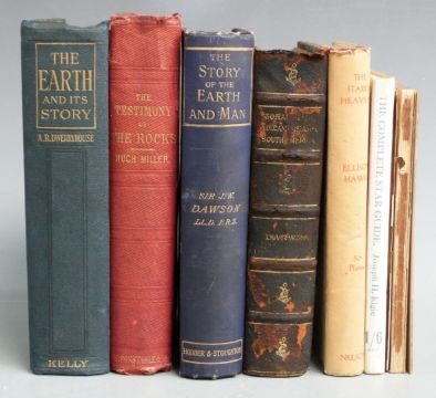 Charles Darwin On The Structure and Distribution of Coral Reefs etc bound in half leather, The Testimony of The Rocks or Geology in its Bearings on the Two Theologies Natural and Revealed by Hugh Miller 1857 in original gilt lettered cloth, The Geology of the English Lake District by John Postlethwaite 1897, The Earth & Its Story Illustrated, The Story of The Earth & Man by Dawson 1903, The Starry Heavens and Complete Star Guide (7)