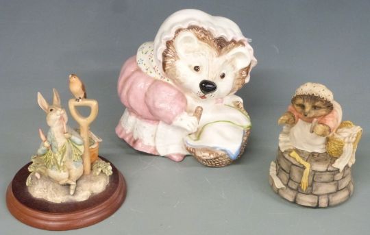 Border Fine Arts, Royal Doulton and other figures including boxed 'The Brain of Pooh', Beatrix Potter badges, Peter Rabbit in Mr McGregor's Garden and Going Sledging