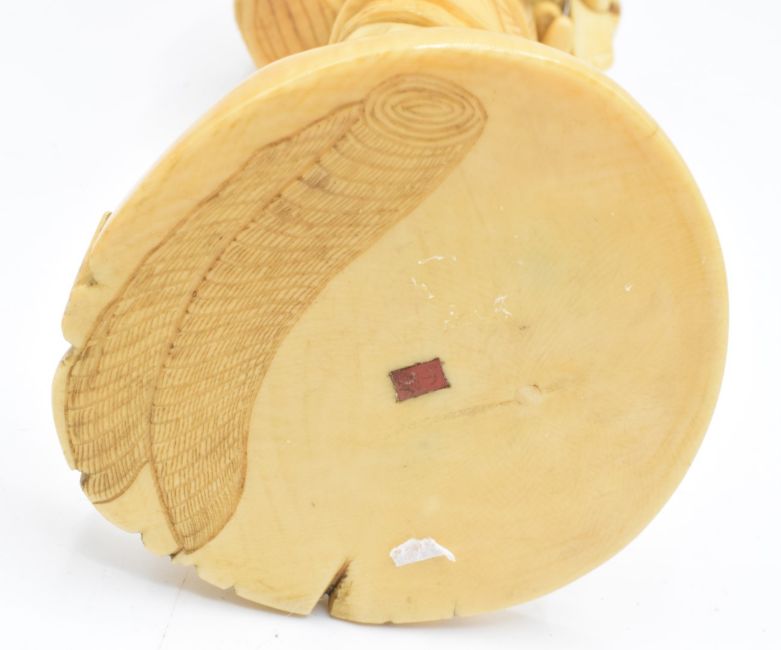 A 19thC Japanese Meiji period signed ivory okimono of a smiling man with child on his back, with inset signature to base,  H16cm