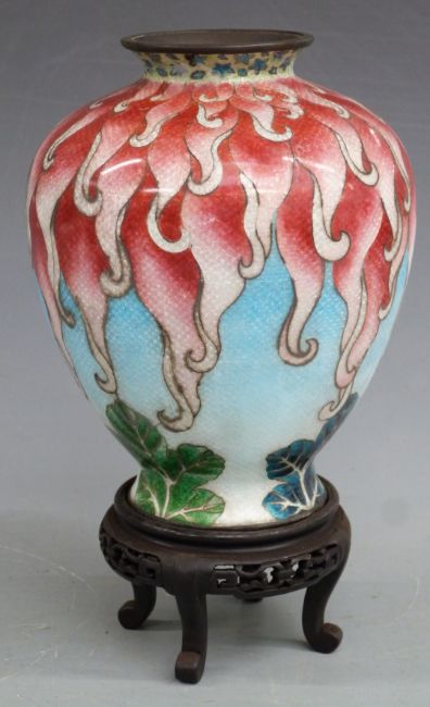 A late 19th/20thC Japanese Ginbari silver vase on stand decorated with red tendrils on a pale blue ground, H19cm