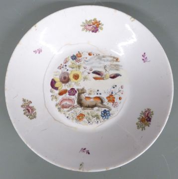 An 18thC dish featuring a deer and a dove in floral landscape, diameter 20cm