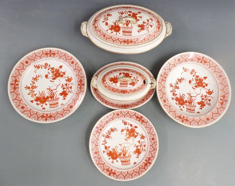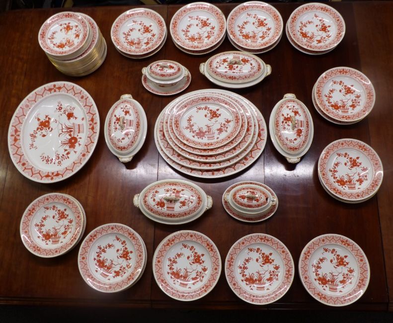 Crown Derby 19thC/20thC dinner service in Chandos pattern, including twenty nine 26cm dinner plates, seventeen 22.5cm plates, eleven 26cm soup bowls, four oval twin-handled covered tureens (L33cm), two gravy/sauce covered tureens with underplates (L24cm), large oval meat plate with well (L48cm), five graduated oval plates from 29-49cm, approximately 72 pieces