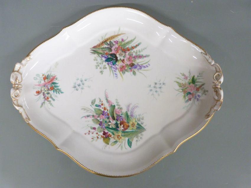 Royal Worcester late 19thC ribbon handled shallow dish or tray, hand decorated with bouquets of summer flowers, L38cm