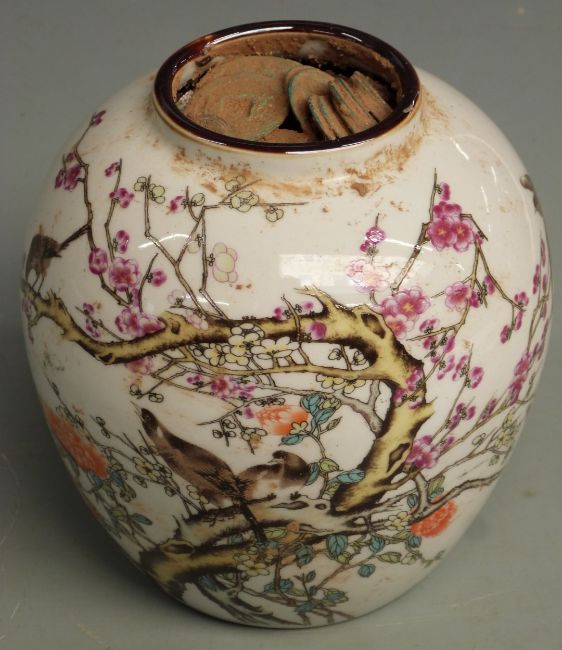 Chinese ceramic vase decorated with birds in a tree, filled solidly with coins, H15cm tall