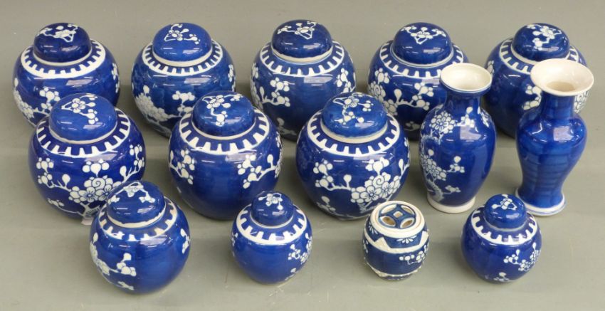 Fourteen items of Chinese blue and white porcelain comprising eleven prunus flower ginger jars with lids, two vases and a container, largest 15cm