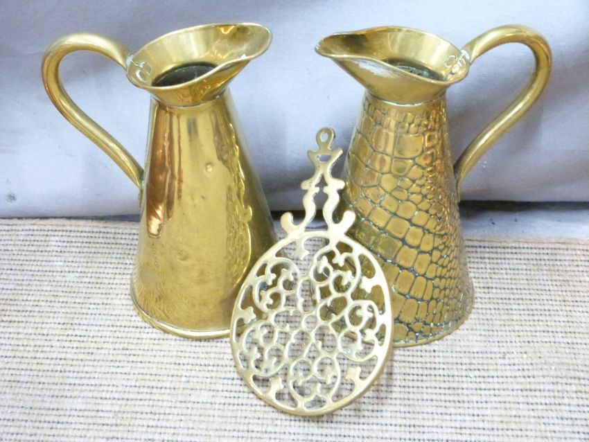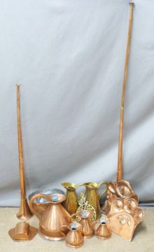 Copper and brass ware including two coaching horns, graduated copper measuring jugs with impressed marks, Art Nouveau pans, jelly mould, wall sconce etc, tallest 25.5cm