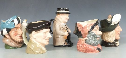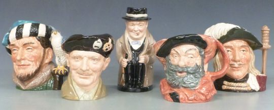 Five Royal Doulton large character and Toby jugs including Winston Churchill and Monty, tallest 23cm