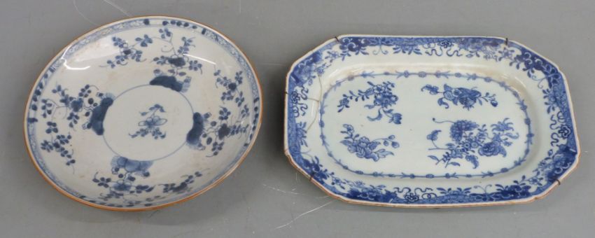 Two 19th/ 20thC Chinese blue and white dishes both with floral decoration, one 22cm in diameter, the other octagonal 28 x 19.5cm