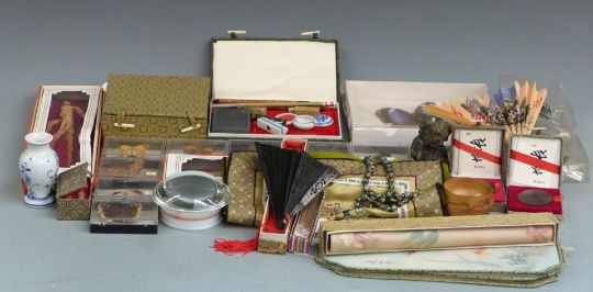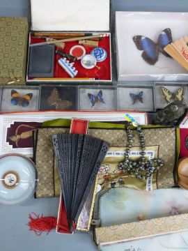 A collection of Chinese collectables, taxidermy butterflies, ink sets, soapstone etc